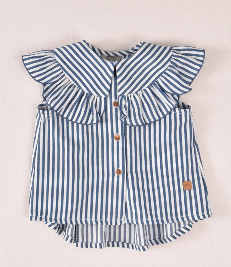 Blusa a rallas en color denim y blanco, con maxi cuello, de la marca José Varón.