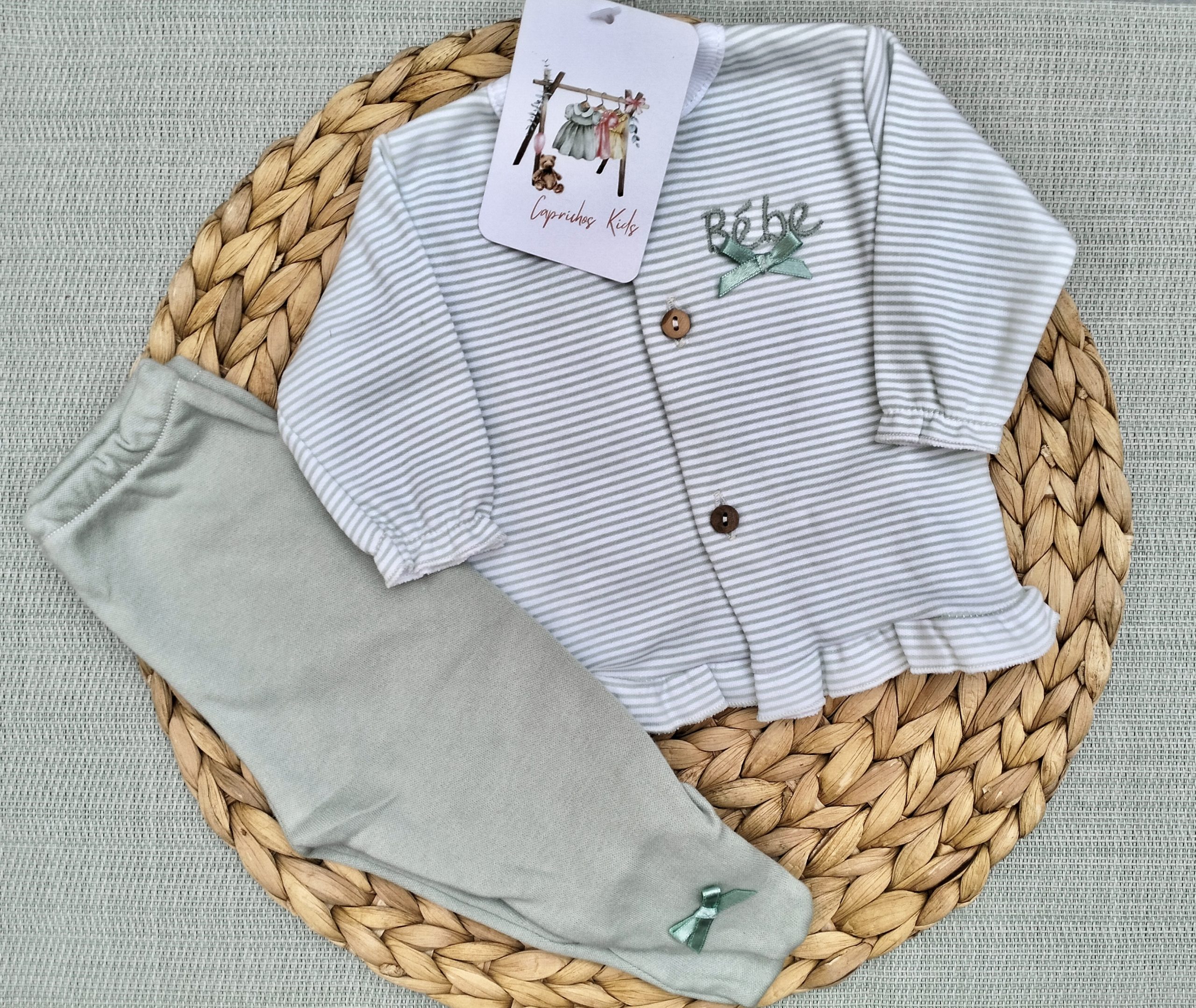 Conjunto de algodón para bebé, compuesto por camiseta de rayas con botones frontales y pantalón liso en tono verde suave, decorado con pequeños lazos.