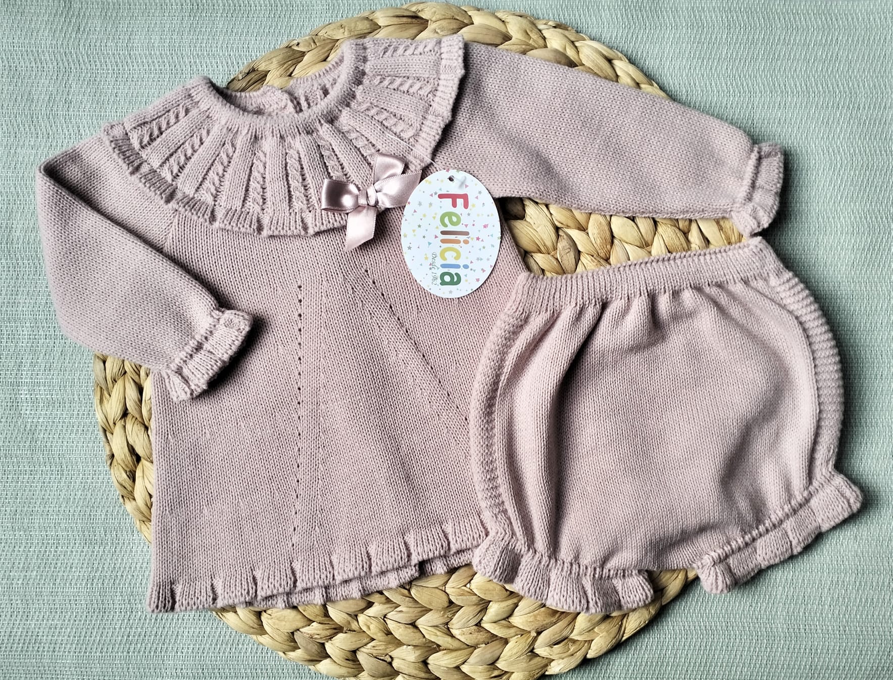 Sofisticado conjunto de bebé confeccionado en punto suave y cálido, presentado en un elegante tono maquillaje empolvado. El jersey cuenta con un bonito canesú trabajado y un delicado lazo decorativo en el delantero que aporta un toque refinado y dulce. Se acompaña de cubrepañal a juego con suaves acabados elásticos que garantizan comodidad y libertad de movimiento. Un conjunto ideal para ocasiones especiales, celebraciones o para quienes buscan un estilo clásico con un acabado cuidado y de alta calidad.