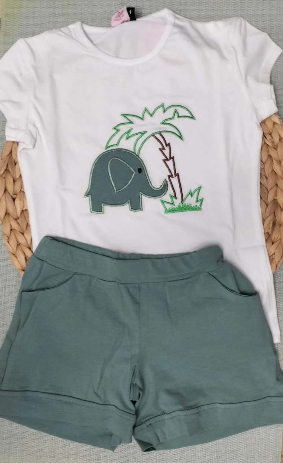 Conjunto de dos piezas, con estampado de un elefante en verde.