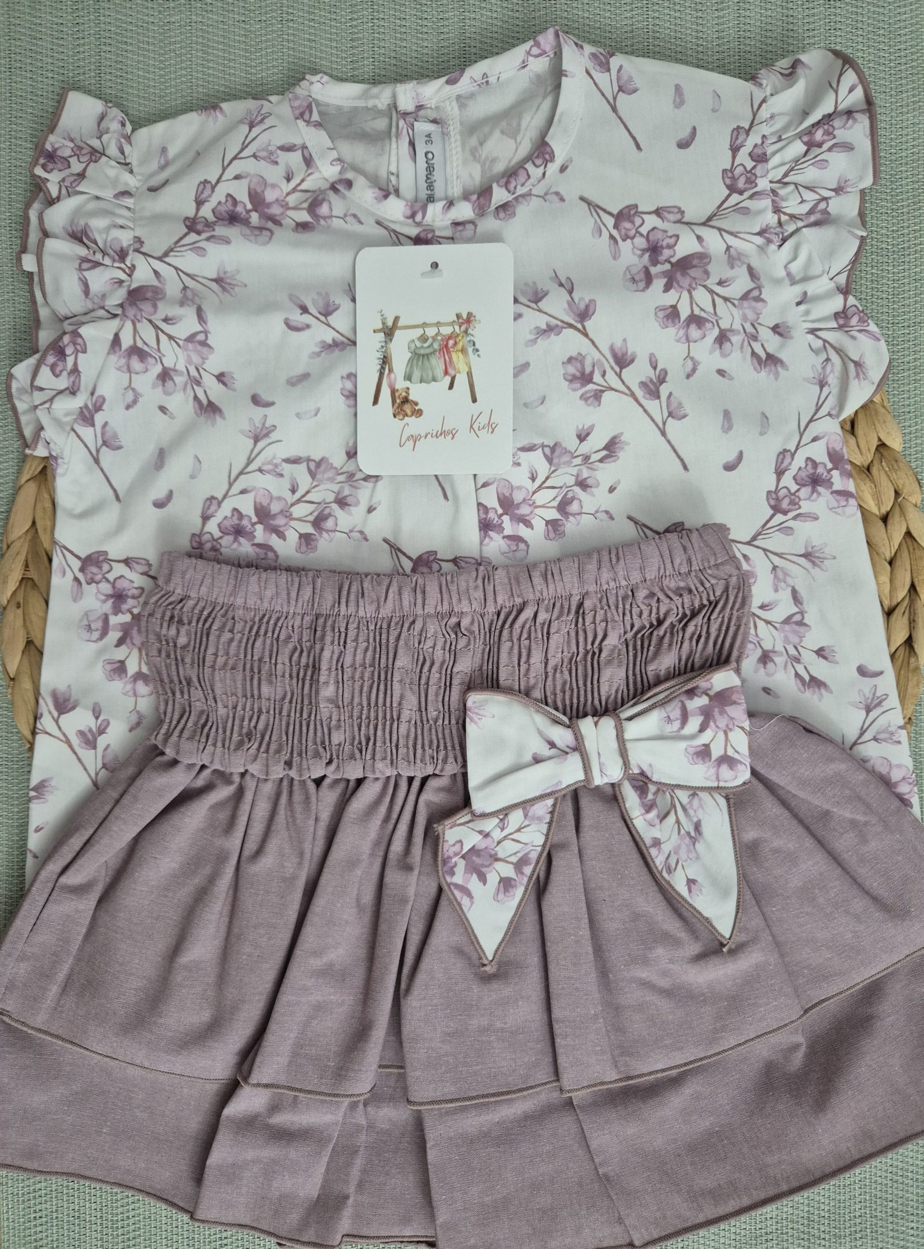 Conjunto de camisa y falda, con cintura elástica y adorno de niña en la cinturilla de la falda, con estampado floral en tonos malva.
