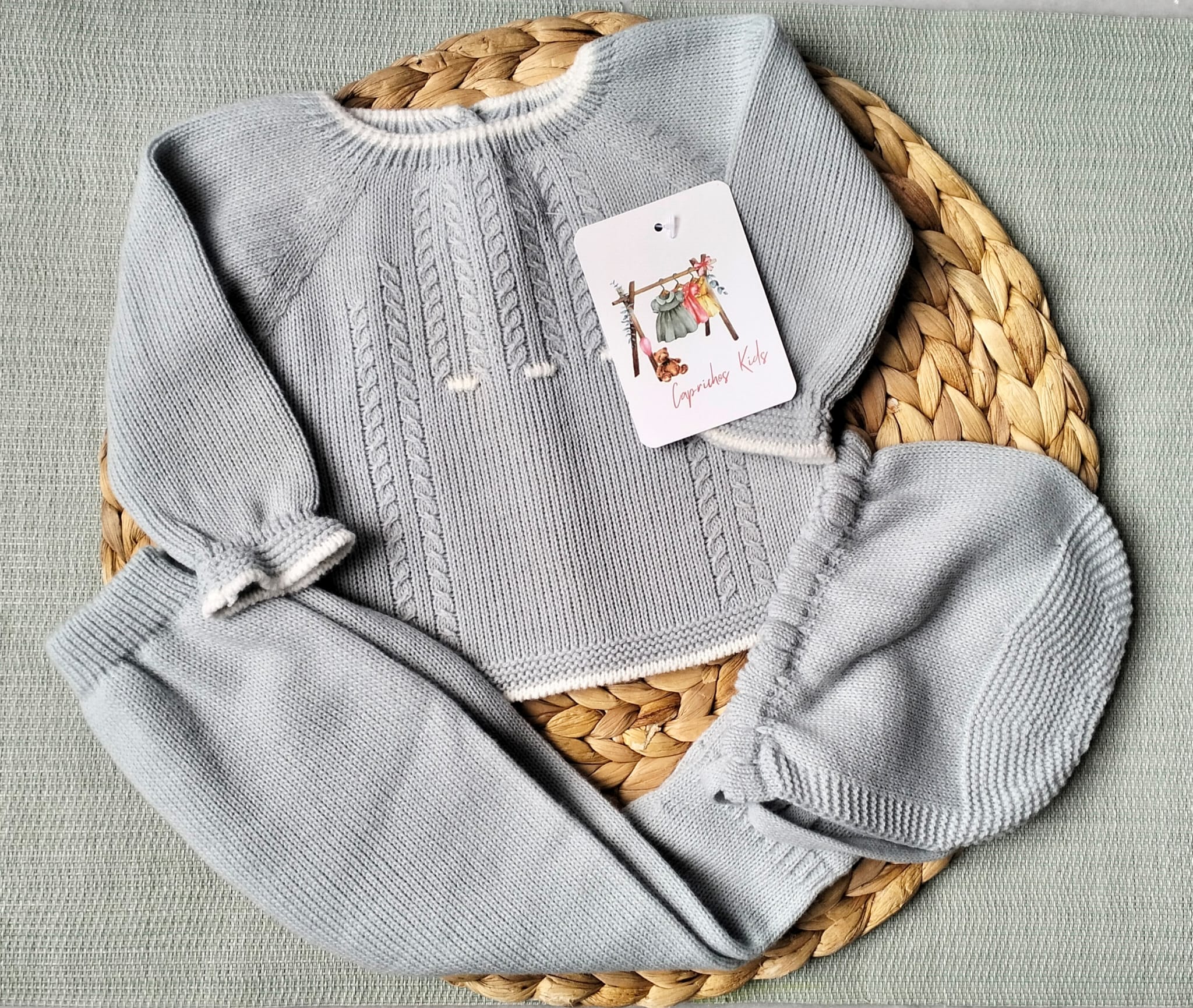 Precioso conjunto de bebé confeccionado en punto suave de alta calidad, presentado en un delicado tono iceberg. El jersey destaca por sus finos detalles trenzados en el delantero y un diseño cuidadosamente elaborado que aporta un estilo clásico y atemporal. Incluye pantalón a juego con cintura elástica para mayor comodidad y gorrito coordinado que completa el conjunto de forma armoniosa. Ideal para ocasiones especiales o para vestir al bebé con elegancia y confort en su día a día.