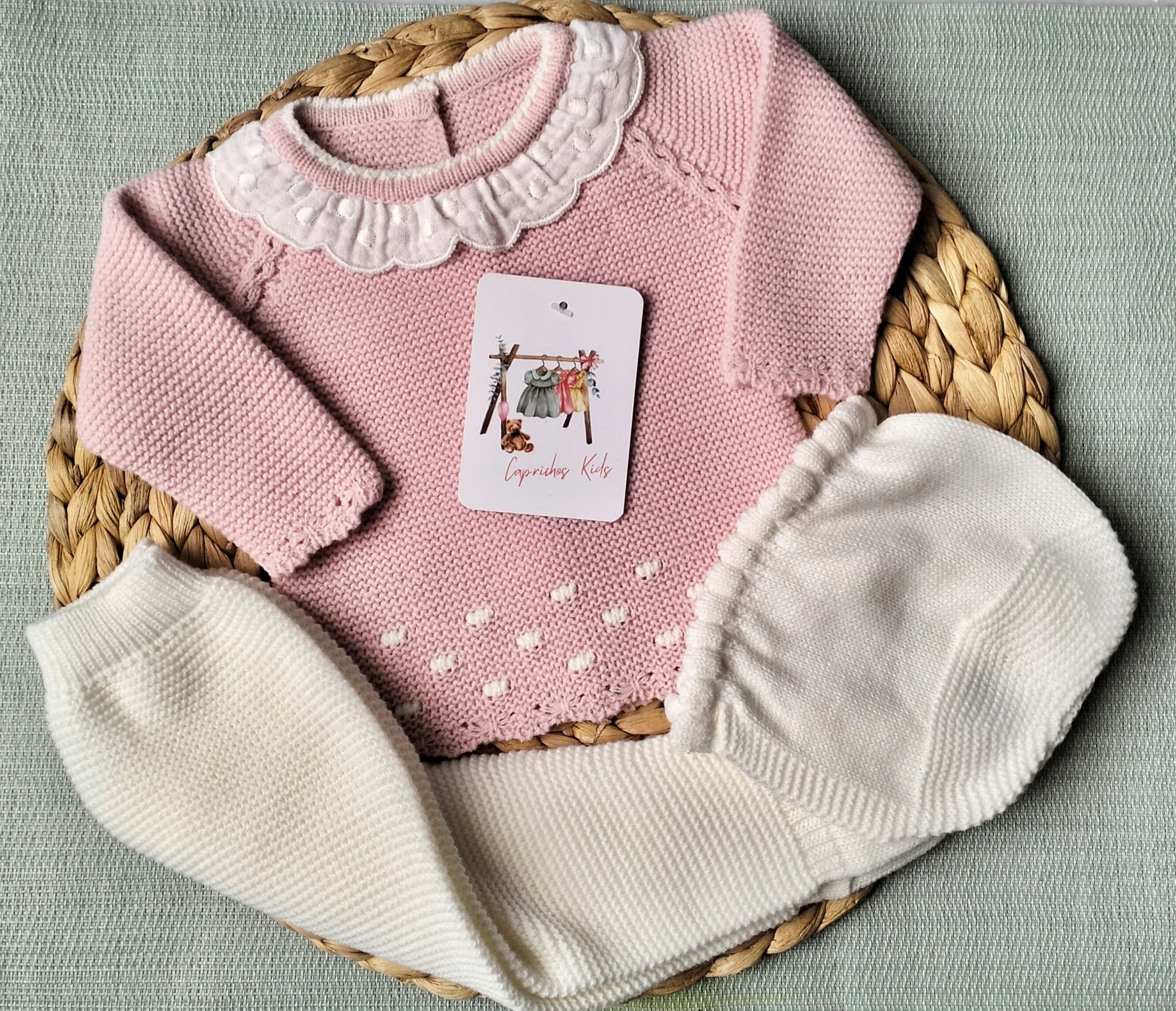 Conjunto de punto rosa con cuello blanco bordado, dulce y delicado para los primeros meses del bebé.