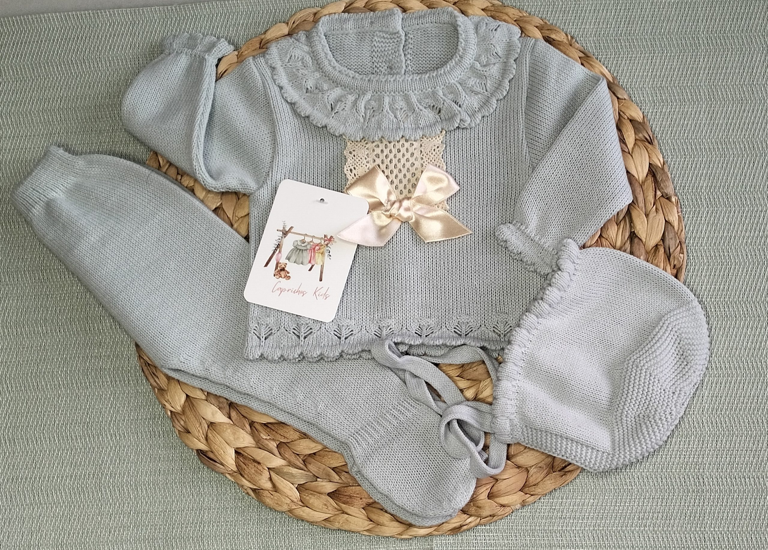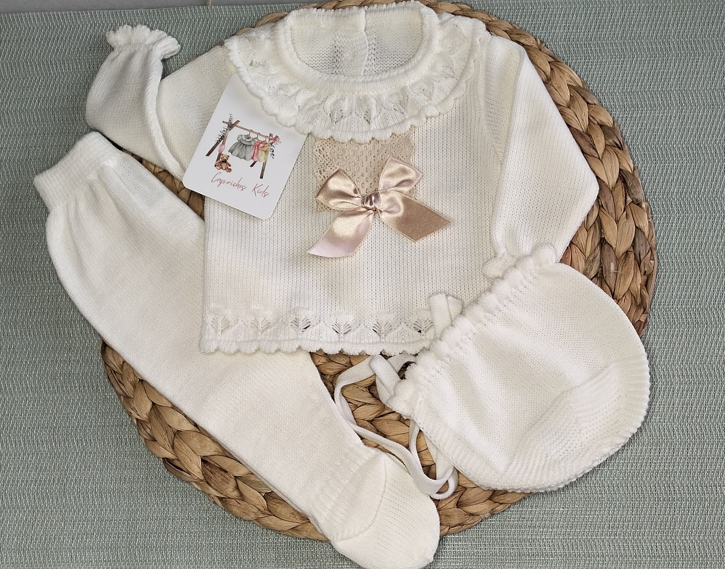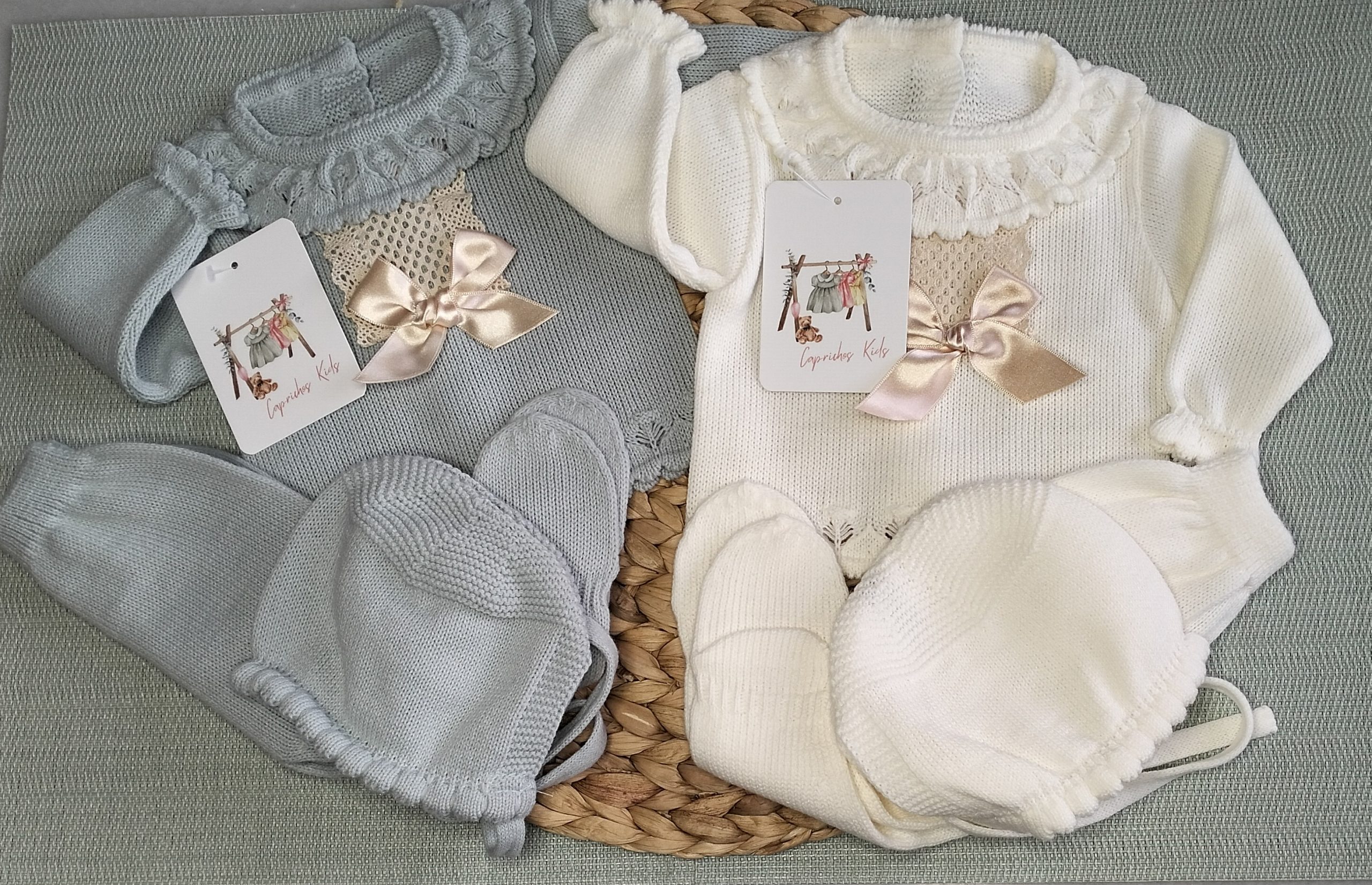 Estos encantadores conjuntos de polainas para bebé están diseñados con un toque de elegancia y suavidad. El conjunto en iceberg incluye un jersey de manga larga con detalles de encaje en el pecho, un lazo de satén beige en el centro y un cuello redondo adornado con encaje. Las polainas y el gorro a juego completan el conjunto, brindando comodidad y estilo.