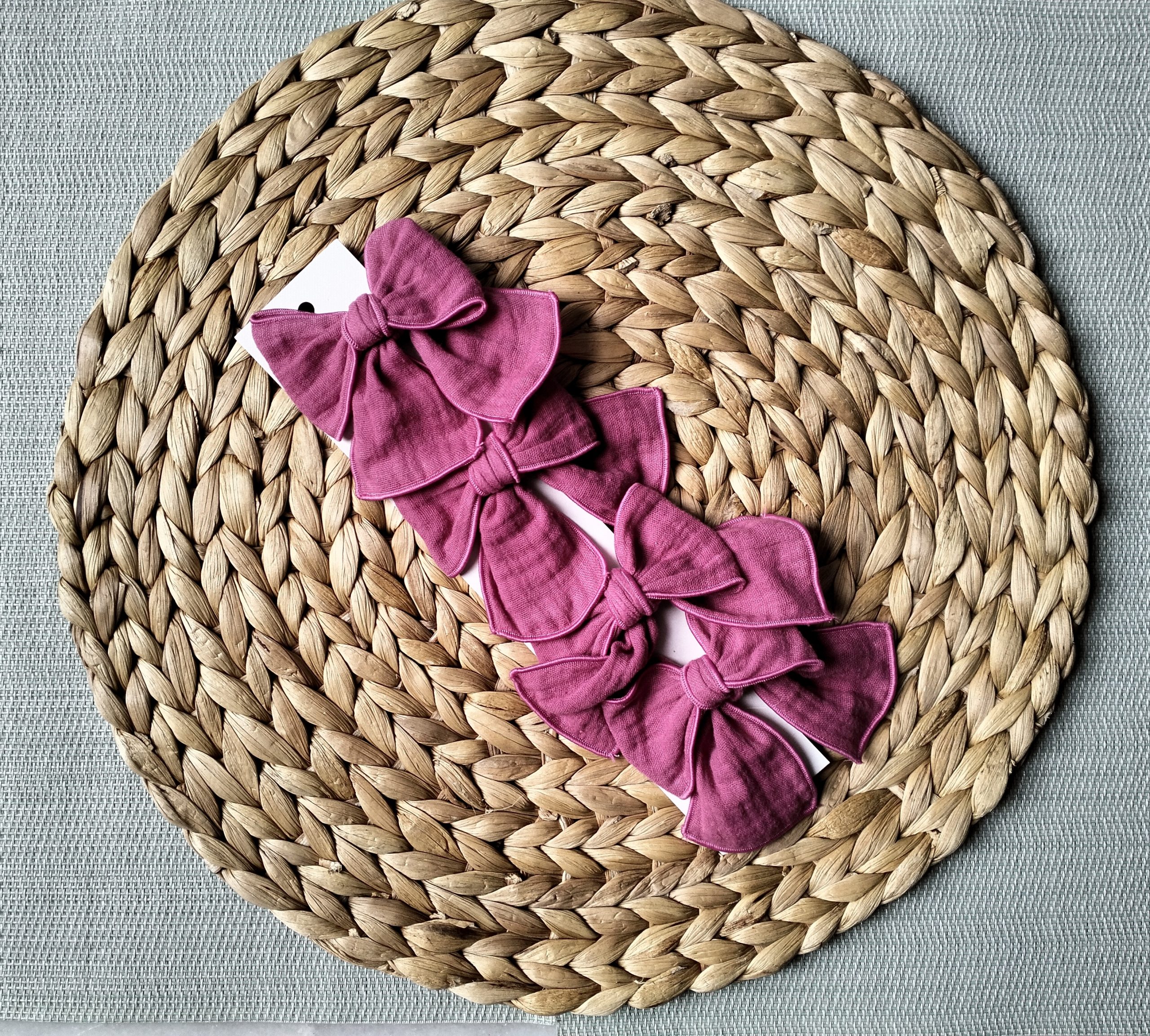 Pinzas de lazo para pelo, en tejido de bambula en tono buganvilla.