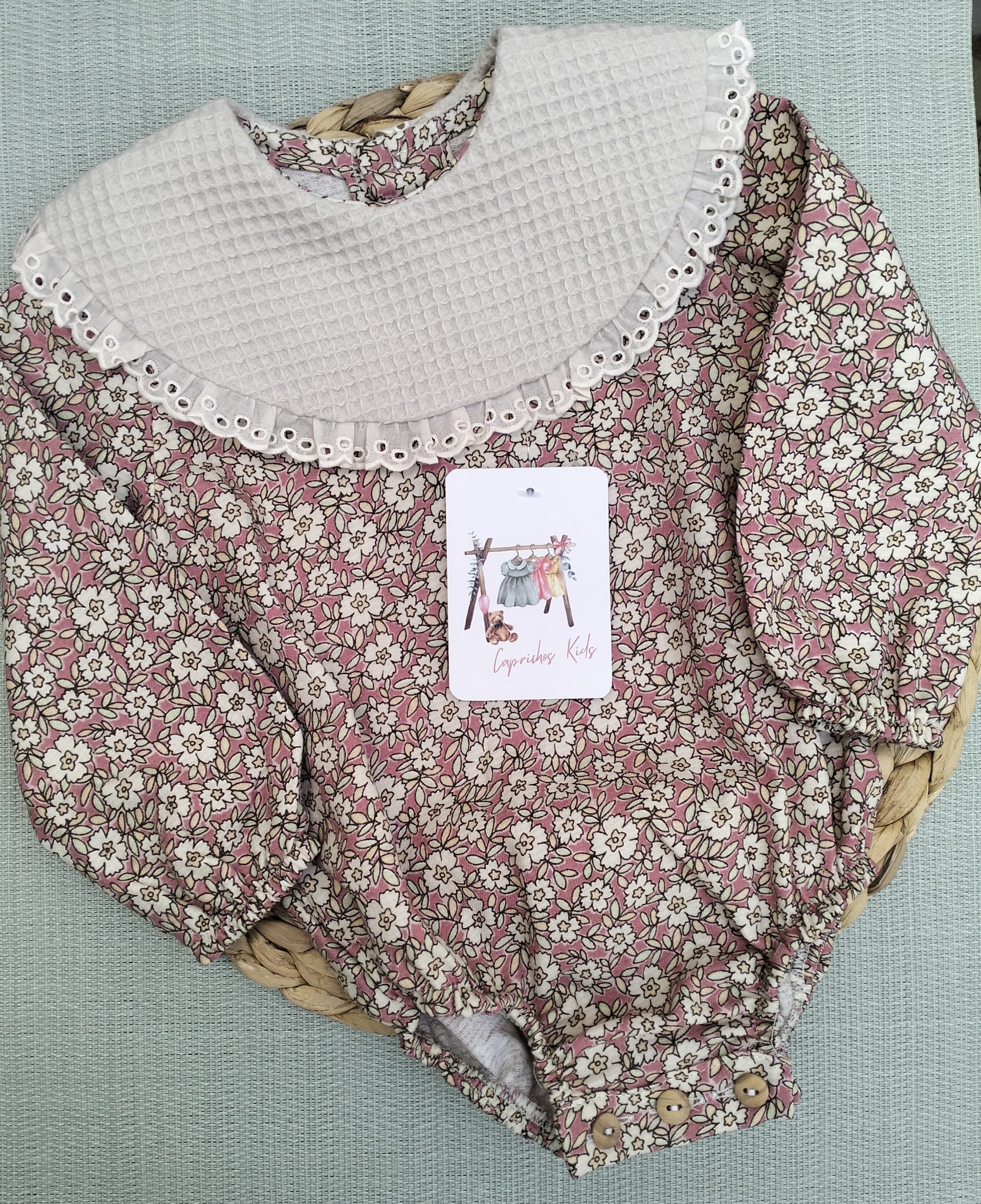 Pelele de algodón con estampado floral en tonos otoñales y maxi cuello en tono beige.