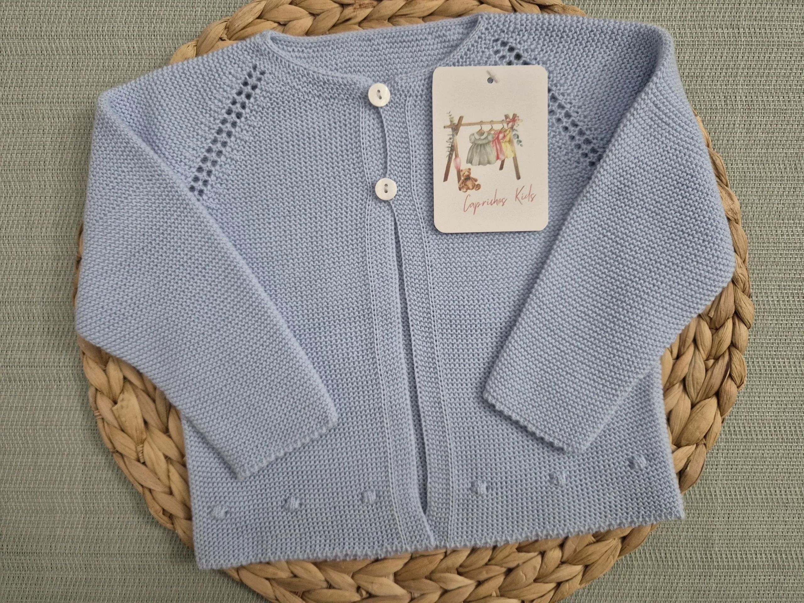 Rebeca de punto en color cielo, calada por los hombros y nudos en la parte de abajo.