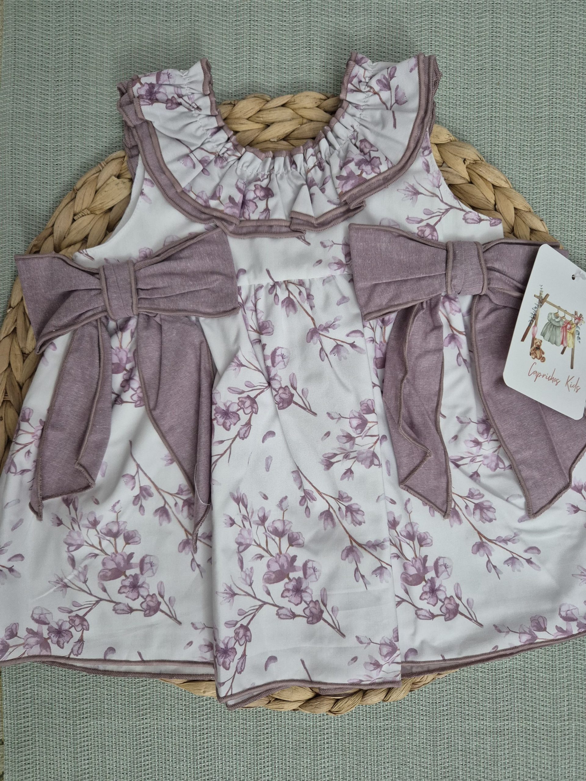 Vestido en tonos malvas, con estampado floral y combinación de dos lazadas en los laterales.